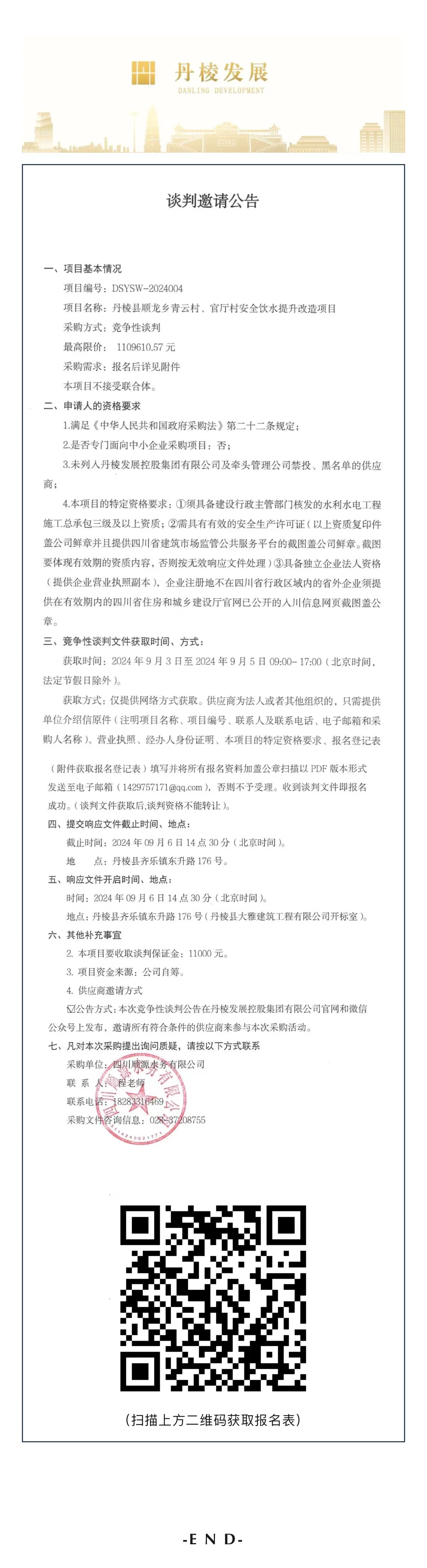 丹棱縣順龍鄉(xiāng)青云村、官廳村安全飲水提升改造項目談判邀請公告
