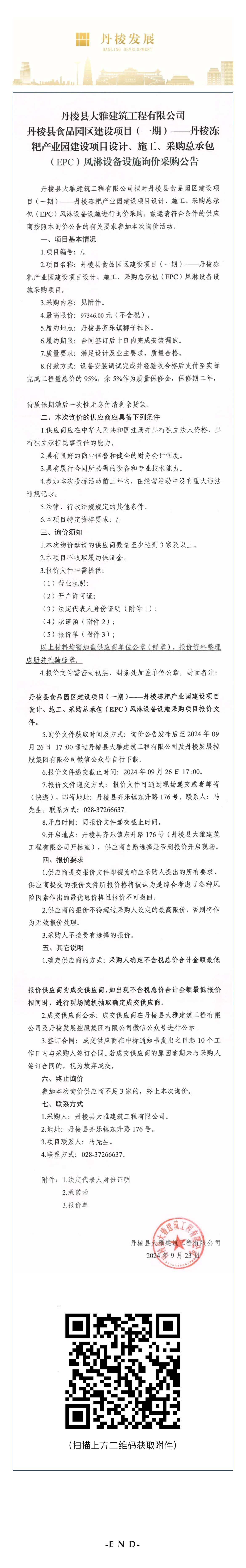 縣大雅建筑公司丹棱縣食品園區(qū)建設(shè)項(xiàng)目(一期)—丹棱凍粑產(chǎn)業(yè)園建設(shè)項(xiàng)目設(shè)計(jì)、施工、采購總承包(EPC)風(fēng)淋設(shè)備設(shè)施詢價采購公告
