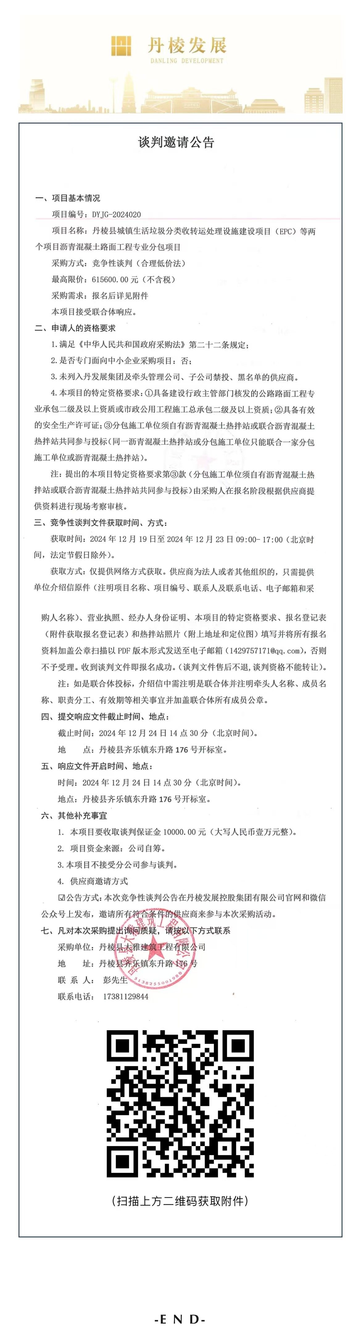 丹棱縣城鎮(zhèn)生活垃圾分類(lèi)收轉(zhuǎn)運(yùn)處理設(shè)施建設(shè)項(xiàng)目(EPC)等兩個(gè)項(xiàng)目瀝青混凝土路面工程專(zhuān)業(yè)分包項(xiàng)目談判邀請(qǐng)公告