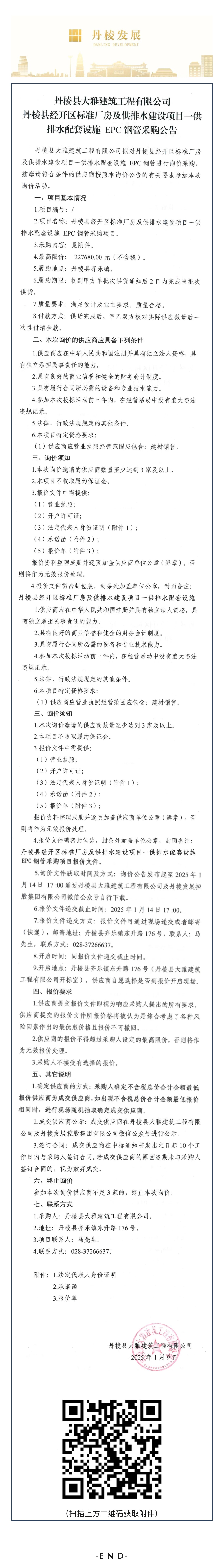 丹棱縣大雅建筑工程有限公司丹棱縣經(jīng)開區(qū)標準廠房及供排水建設(shè)項目一供排水配套設(shè)施 EPC鋼管采購公告