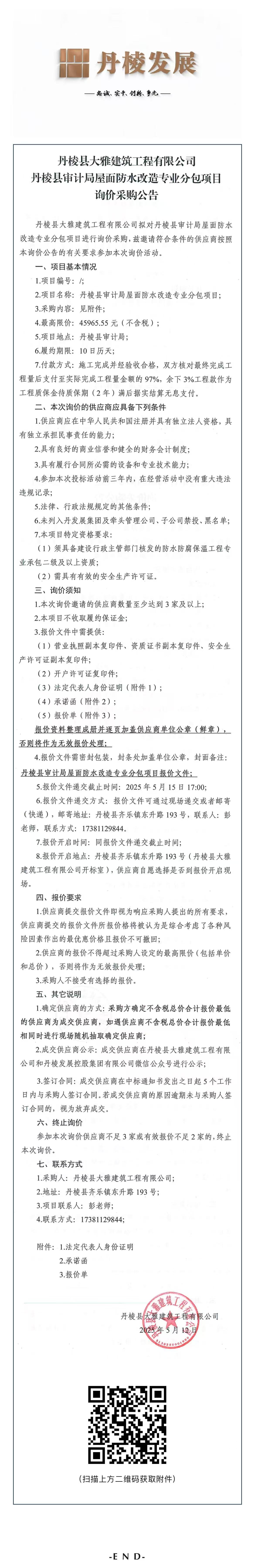 丹棱縣大雅建筑工程有限公司丹棱縣審計(jì)局屋面防水改造專業(yè)分包項(xiàng)目詢價(jià)采購公告