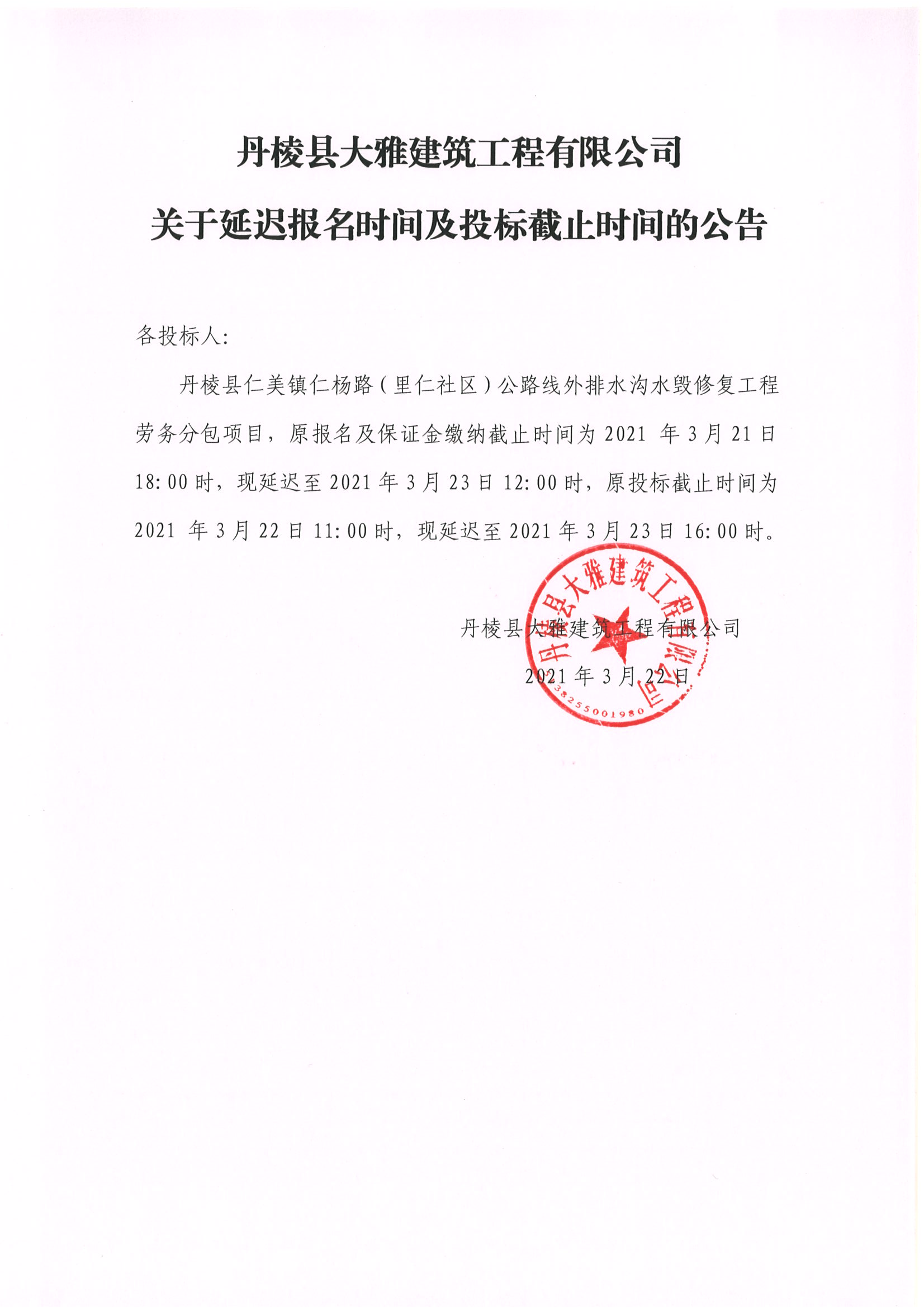 【大雅建筑公司】丹棱縣仁美鎮(zhèn)仁楊路(里仁社區(qū))公路線外排水溝水毀修復(fù)工程勞務(wù)分包關(guān)于延遲報名時間及投標(biāo)截止時間的公告