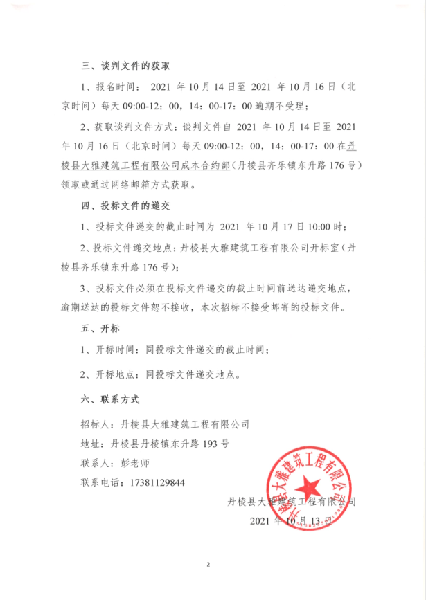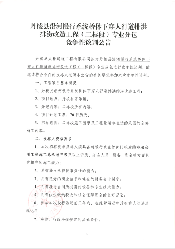【大雅建筑公司】丹棱縣沿河慢行系統(tǒng)橋體下穿人行道排洪排澇改造工程(二標(biāo)段)專(zhuān)業(yè)分包競(jìng)爭(zhēng)性談判公告