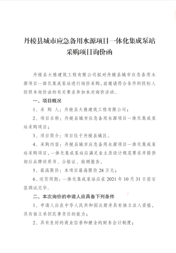 【大雅建筑公司】丹棱縣城市應(yīng)急備用水源項(xiàng)目一體化集成泵站采購(gòu)項(xiàng)目詢(xún)價(jià)函