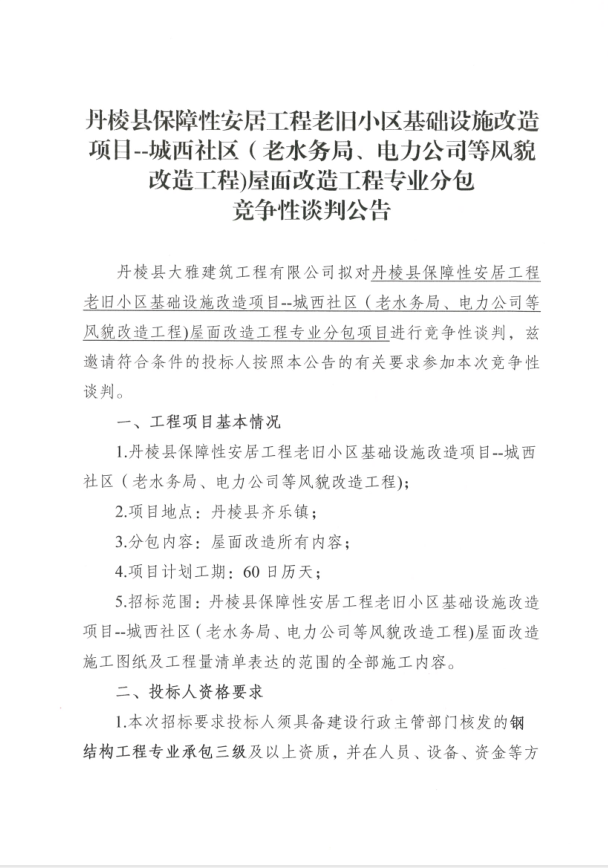 【大雅建筑公司】丹棱縣保障性安居工程老舊小區(qū)基礎(chǔ)設(shè)施改造項(xiàng)目--城西社區(qū)(老水務(wù)局、電力公司等風(fēng)貌改造工程)屋面改造工程專業(yè)分包競(jìng)爭(zhēng)性談判公告