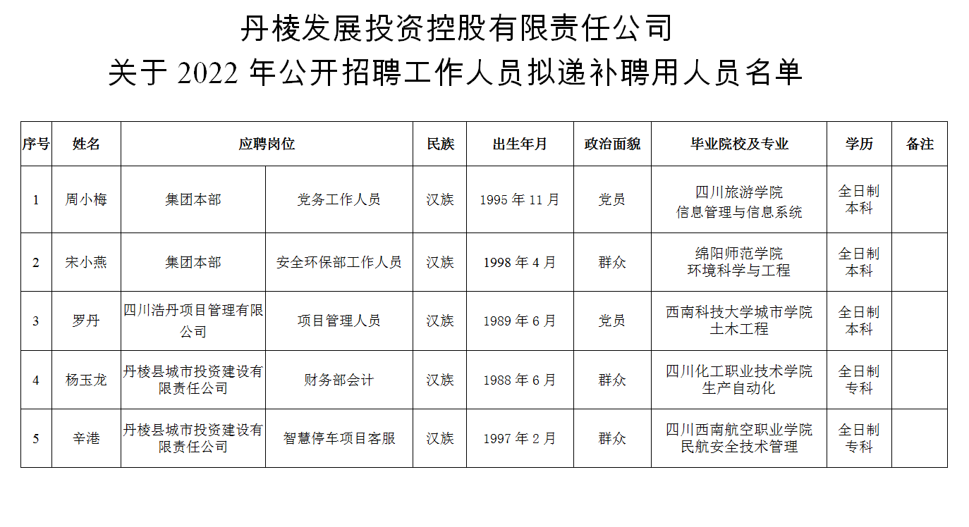 附件:丹棱發(fā)展投資控股有限責(zé)任公司關(guān)于2022年公開(kāi)招聘工作人員擬遞補(bǔ)聘用人員名單
