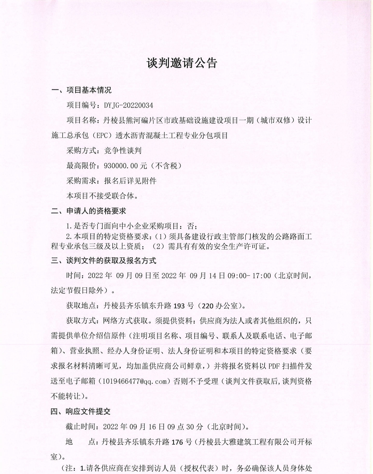 丹棱縣熊河碥片區(qū)市政基礎(chǔ)設(shè)施建設(shè)項(xiàng)目一期(城市雙修)設(shè)計(jì)施工總承包(EPC)透水瀝青混凝土工程專業(yè)分包項(xiàng)目談判邀請(qǐng)公告