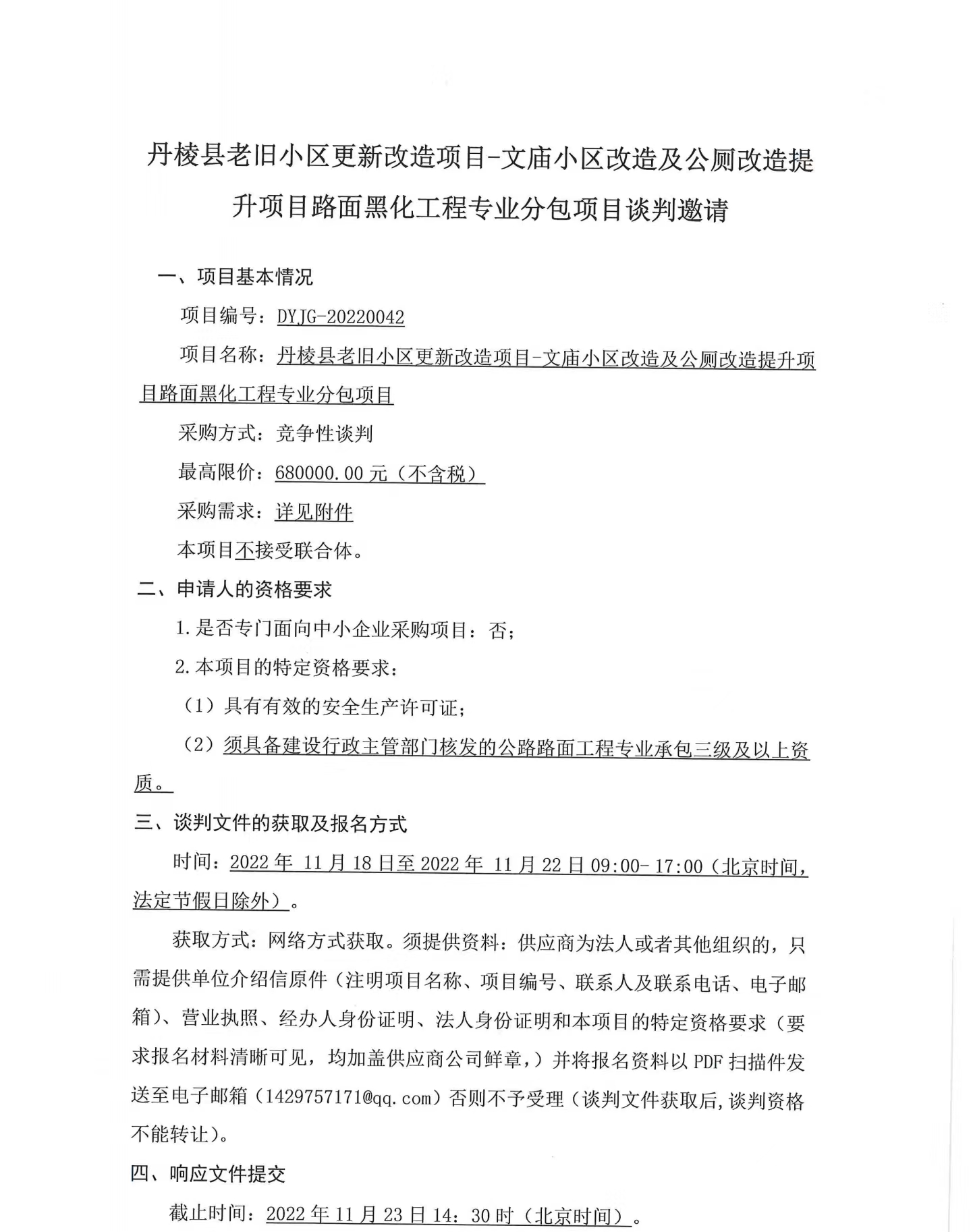 丹棱縣老舊小區(qū)更新改造項(xiàng)目-文廟小區(qū)改造及公廁改造提升項(xiàng)目路面黑化工程專(zhuān)業(yè)分包項(xiàng)目競(jìng)爭(zhēng)性談判邀請(qǐng)公告