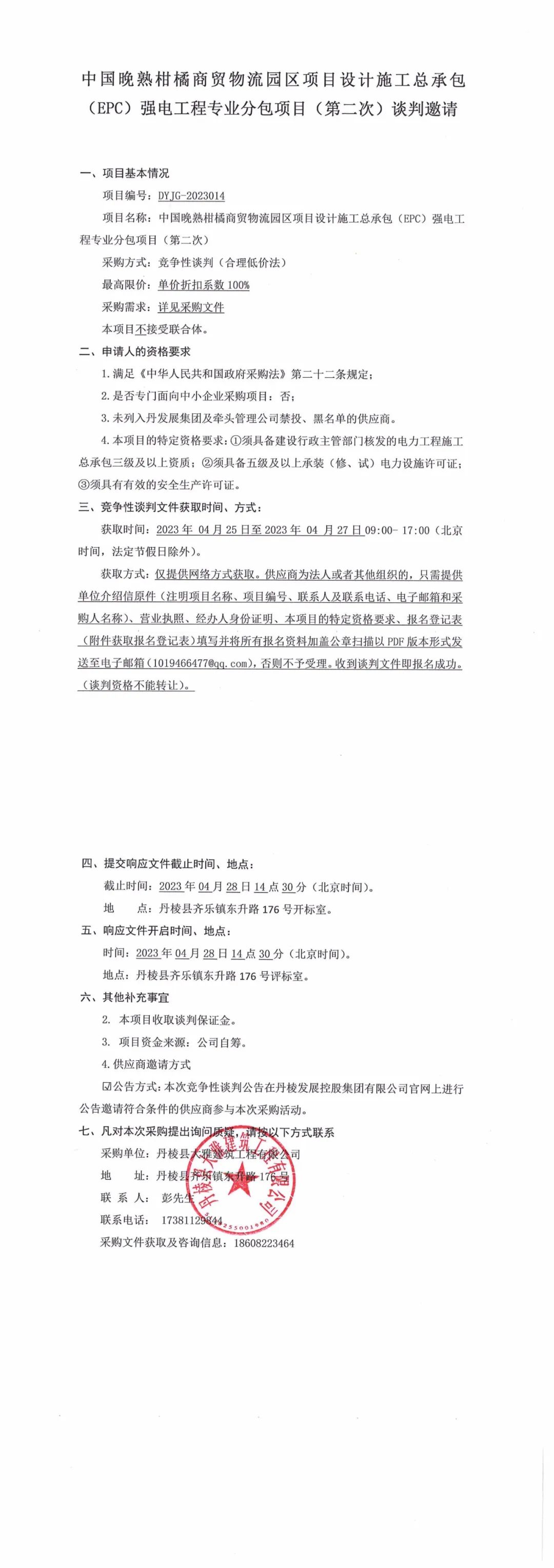 中國晚熟柑橘商貿(mào)物流園區(qū)項目設計施工總承包(EPC)強電工程專業(yè)分包項目(第二次)競爭性談判邀請