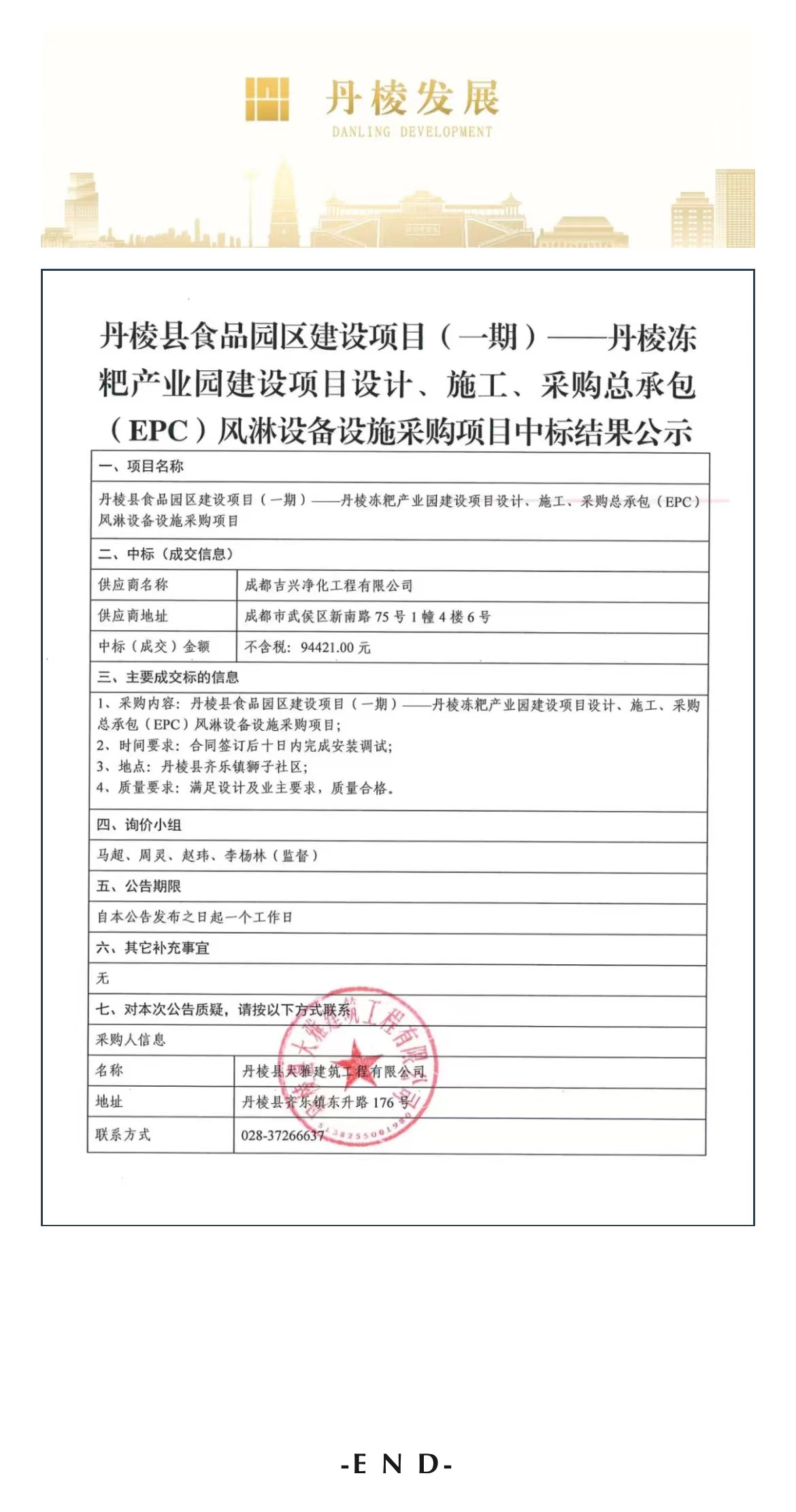 丹棱縣食品園區(qū)建設(shè)項(xiàng)目(一期)—丹棱凍粑產(chǎn)業(yè)園建設(shè)項(xiàng)目設(shè)計(jì)、施工、采購總承包(EPC)風(fēng)淋設(shè)備設(shè)施詢價(jià)采購項(xiàng)目中標(biāo)結(jié)果公示