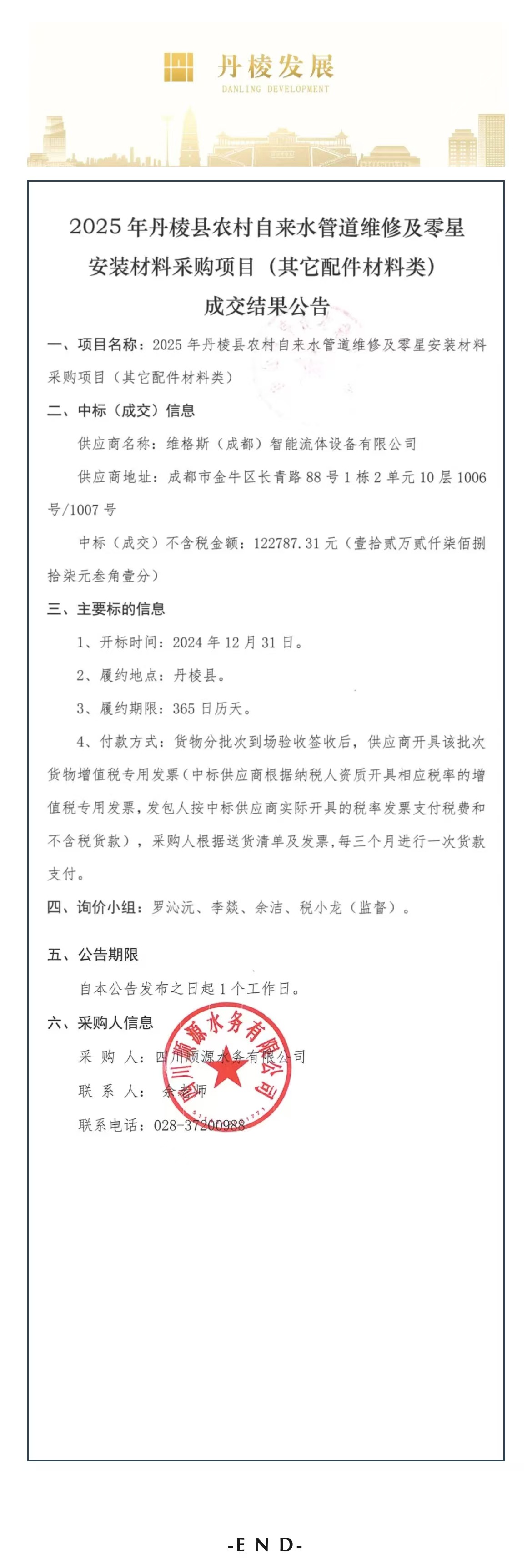 2025年丹棱縣農(nóng)村自來水管道維修及零星安裝材料采購項(xiàng)目(其他配件材料類)成交結(jié)果公告