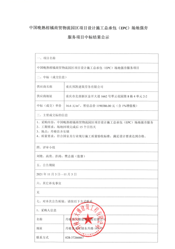 【大雅建筑公司】中國晚熟柑橘商貿(mào)物流園區(qū)項目設(shè)計施工總承包(EPC)場地強夯服務(wù)項目中標結(jié)果公示