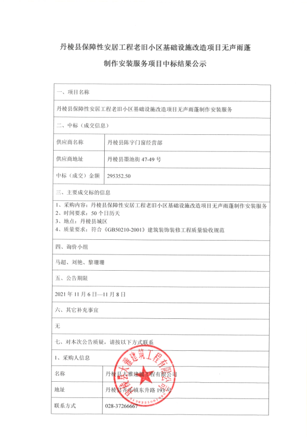 【大雅建筑公司】丹棱縣保障性安居工程老舊小區(qū)基礎(chǔ)設(shè)施改造項(xiàng)目無(wú)聲雨蓬制作安裝服務(wù)項(xiàng)目中標(biāo)結(jié)果公示