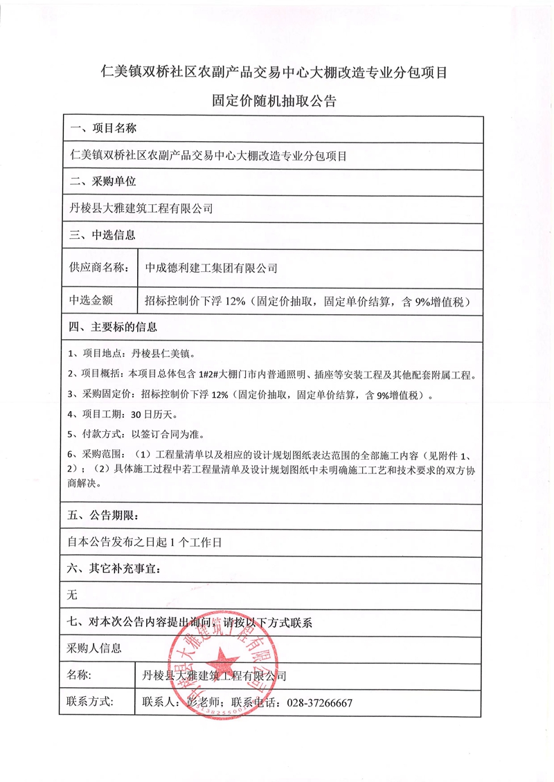 仁美鎮(zhèn)雙橋社區(qū)農(nóng)副產(chǎn)品交易中心大棚改造專業(yè)分包項目固定價隨機抽取公告