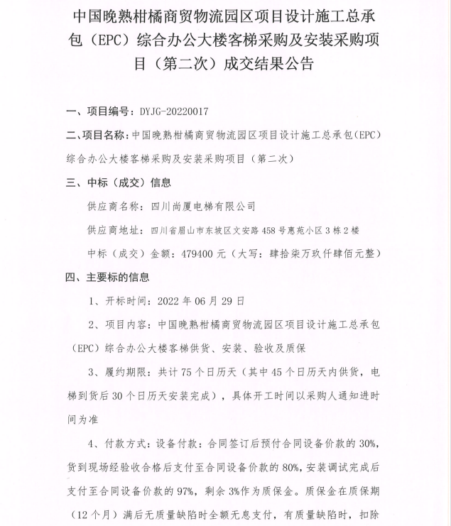 中國晚熟柑橘商貿(mào)物流園區(qū)項目設計施工總承包(EPC)綜合辦公大樓客梯采購及安裝采購項目(第二次)成交結果公告