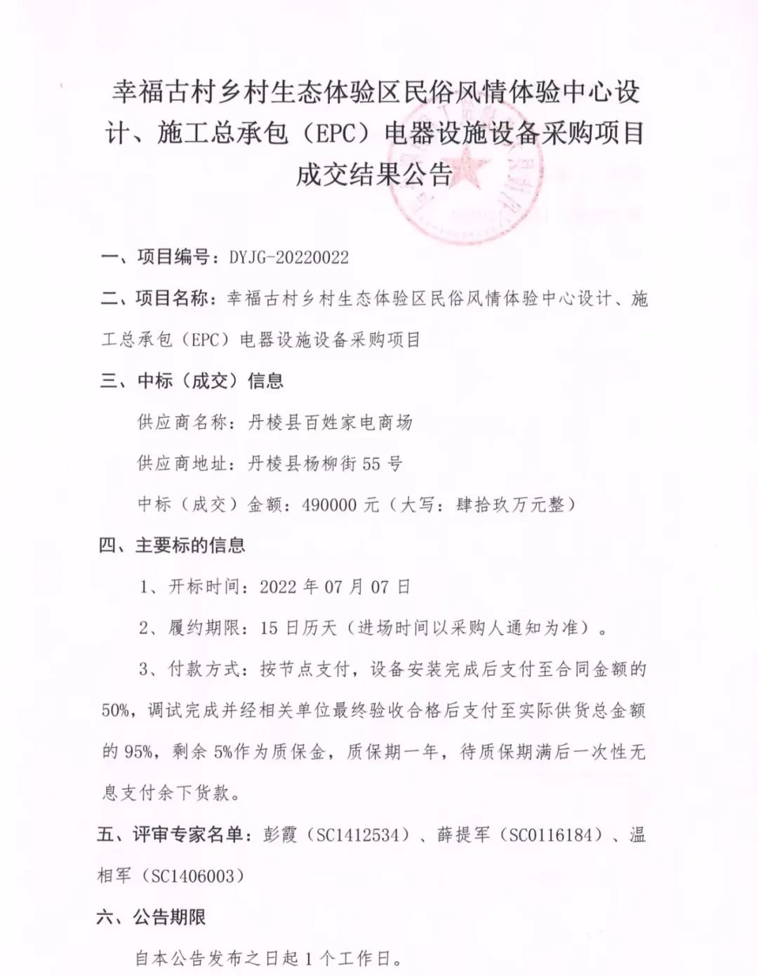 幸福古村鄉(xiāng)村生態(tài)體驗(yàn)區(qū)民俗風(fēng)情體驗(yàn)中心設(shè)計(jì)、施工總承包(EPC)電器設(shè)施設(shè)備采購(gòu)項(xiàng)目成交結(jié)果公告