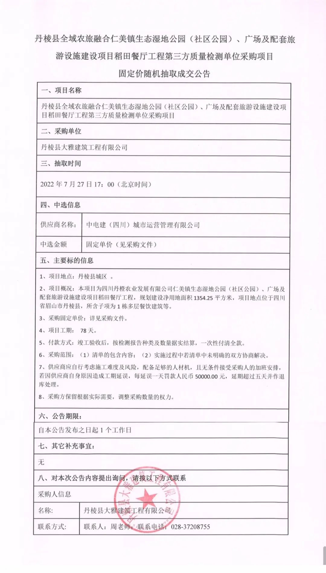 仁美鎮(zhèn)生態(tài)濕地公園(社區(qū)公園)、廣場及配套旅游設施建設項目稻田餐廳工程第三方質量檢測單位采購項目固定價隨機抽取成交公告