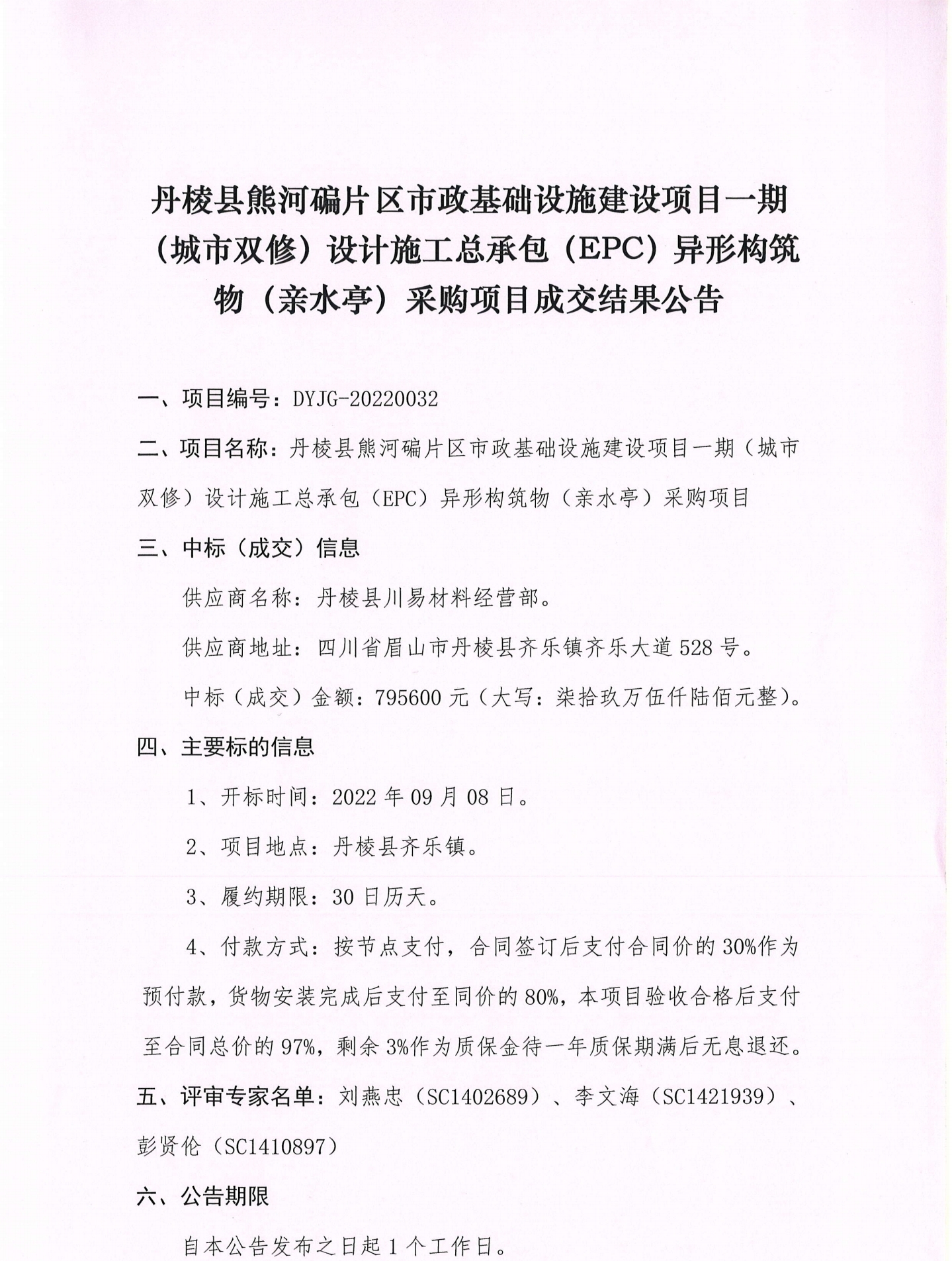 丹棱縣熊河碥片區(qū)市政基礎設施建設項目一期(城市雙修)設計施工總承包(EPC)異形構筑物(親水亭)采購項目成交結果公告