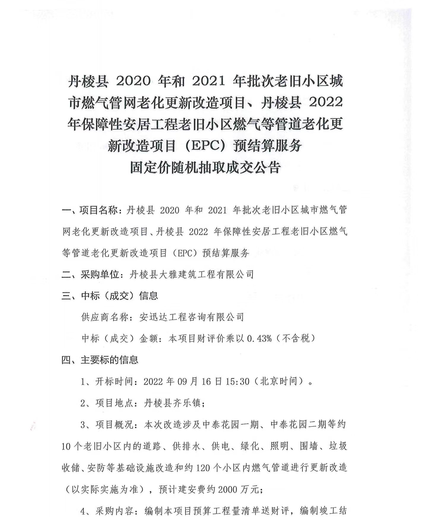 丹棱縣 2020 年、2021年及2022年批次老舊小區(qū)城市燃?xì)夤芫W(wǎng)老化更新改造項(xiàng)目預(yù)結(jié)算服務(wù)固定價(jià)隨機(jī)抽取成交公告