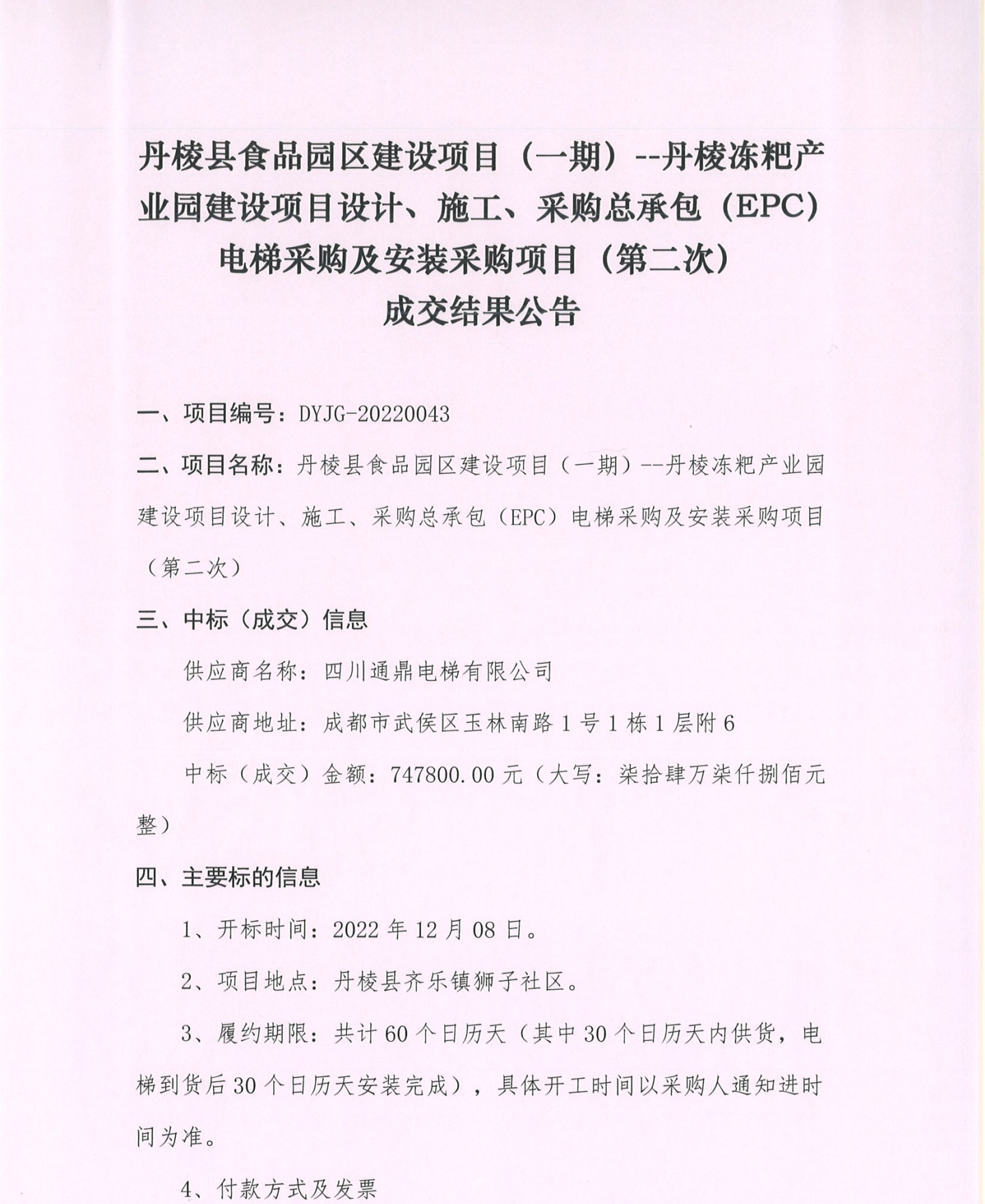 丹梭縣食品園區(qū)建設項目 (一期) --丹棱凍粑產(chǎn)業(yè)園建設項目設計、施工、采購總承包 (EPC)電梯采購及安裝采購項目 (第二次)成交結(jié)果公告