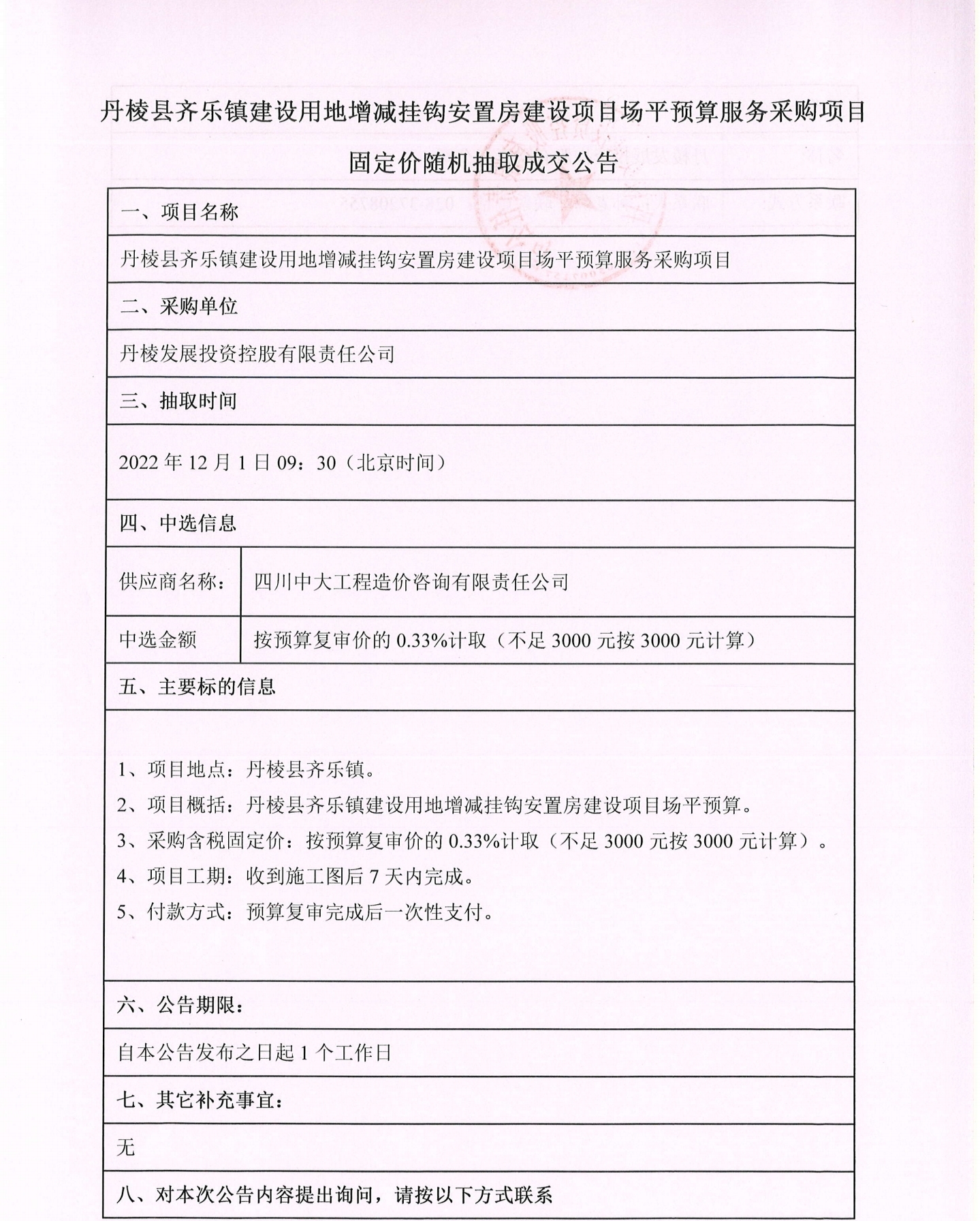 丹棱縣齊樂鎮(zhèn)建設(shè)用地增減掛鉤安置房建設(shè)項(xiàng)目場(chǎng)平預(yù)算服務(wù)采購項(xiàng)目固定價(jià)隨機(jī)抽取成交公告