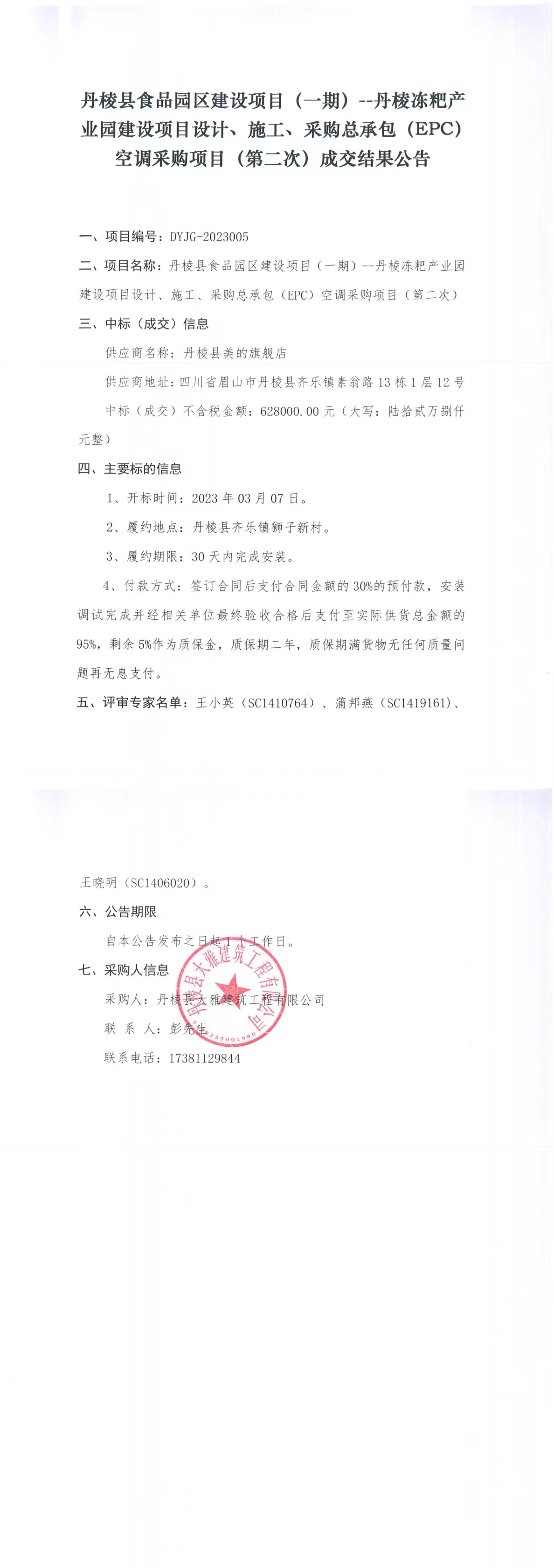 丹棱縣食品園區(qū)建設項目(一期)--丹棱凍粑產(chǎn)業(yè)園建設項目設計、施工、采購總承包(EPC)空調(diào)采購項目(第二次)成交結(jié)果公告