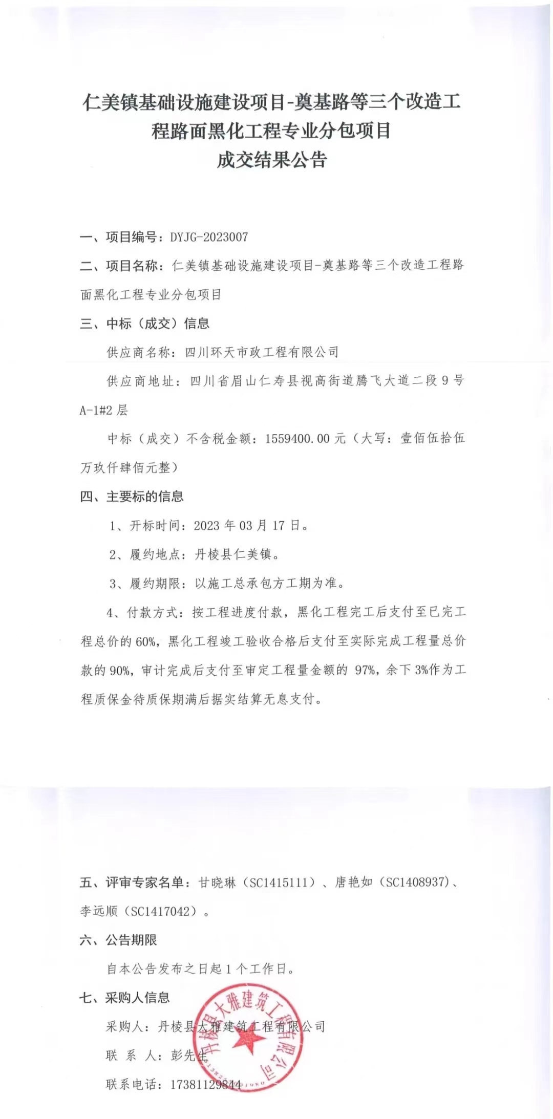 仁美鎮(zhèn)基礎(chǔ)設(shè)施建設(shè)項(xiàng)目-奠基路等三個(gè)改造工程路面黑化工程專(zhuān)業(yè)分包項(xiàng)目成交結(jié)果公告