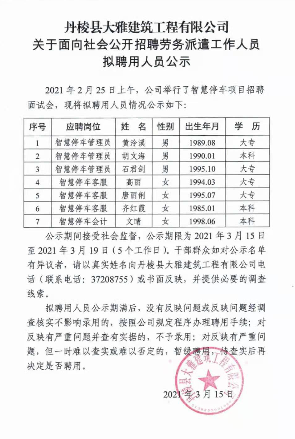 【大雅建筑公司】關于面向社會公開招聘勞務派遣工作人員擬聘用人員公示