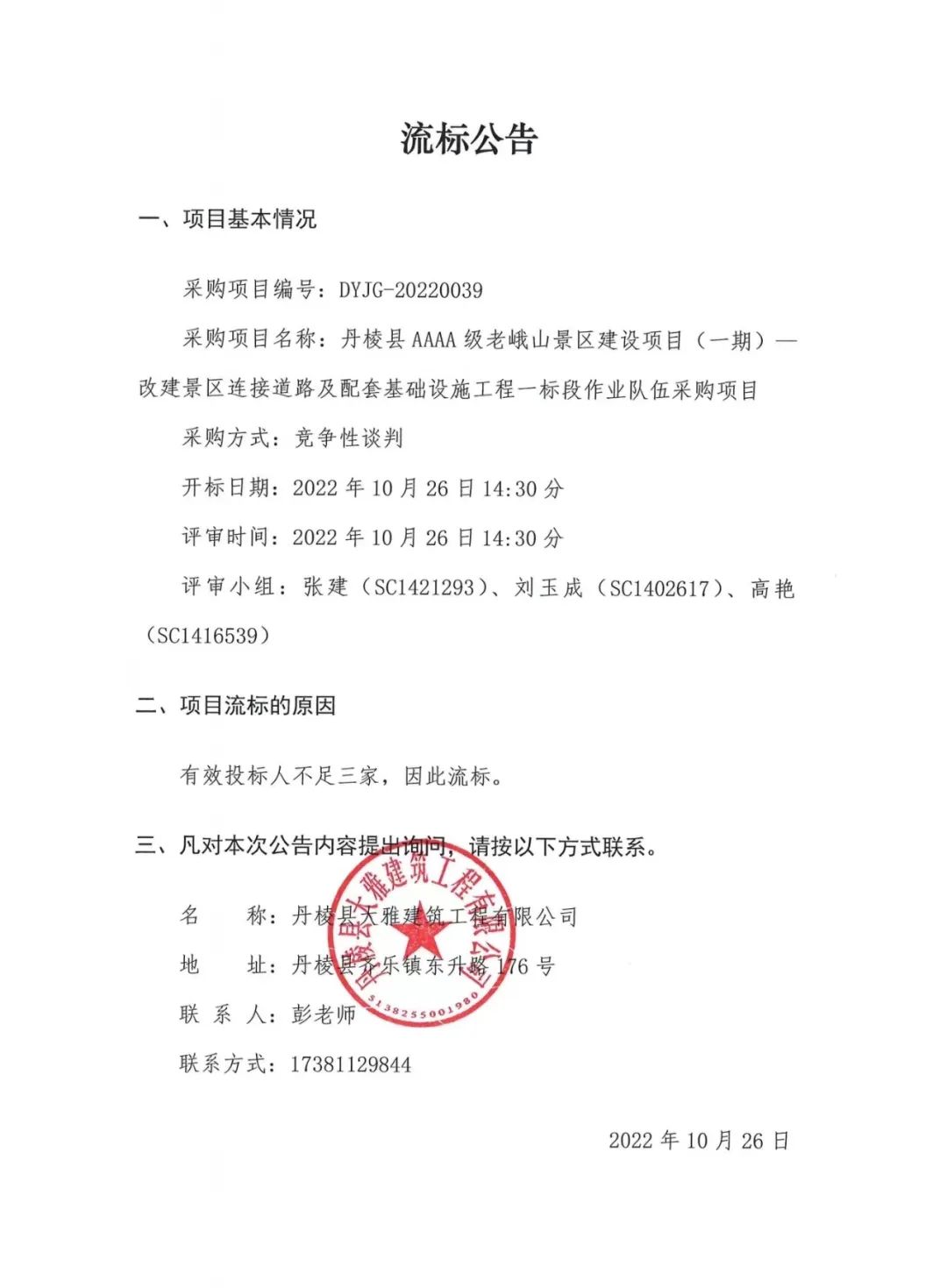 丹棱縣AAAA級(jí)老峨山景區(qū)建設(shè)項(xiàng)目(一期)--改建景區(qū)連接道路及配套基礎(chǔ)設(shè)施工程一標(biāo)段作業(yè)隊(duì)伍采購(gòu)項(xiàng)目流標(biāo)公告