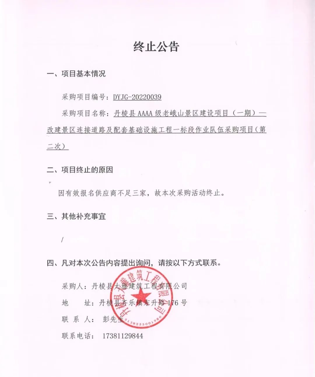 丹棱縣AAAA級老峨山景區(qū)建設(shè)項目(一期)--改建景區(qū)連接道路及配套基礎(chǔ)設(shè)施工程一標段作業(yè)隊伍采購項目(第二次)終止公告
