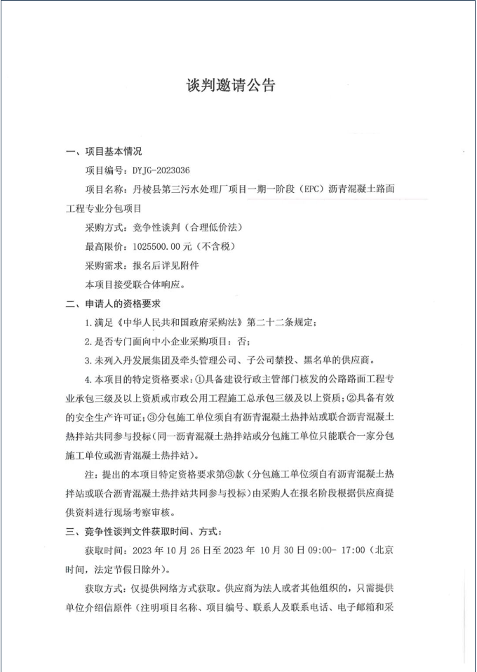 丹棱縣第三污水處理廠項(xiàng)目一期一階段(EPC)瀝青混凝土路面工程專業(yè)分包項(xiàng)目談判邀請(qǐng)公告