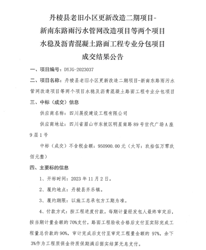 丹棱縣老舊小區(qū)更新改造二期項(xiàng)目-新南東路雨污水管網(wǎng)改造項(xiàng)目等兩個(gè)項(xiàng)目水穩(wěn)及瀝青混凝土路面工程專(zhuān)業(yè)分包項(xiàng)目成交結(jié)果公告