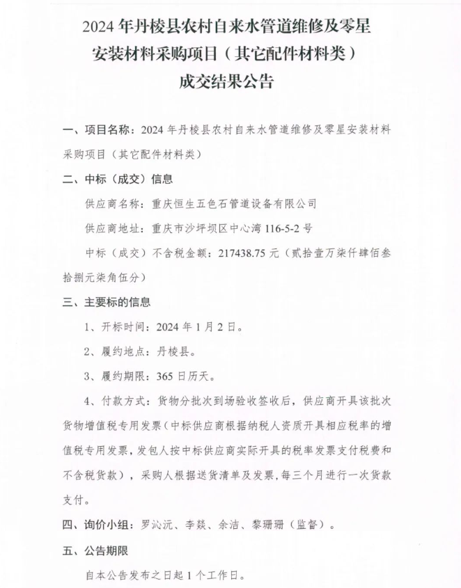 2024年丹棱縣農(nóng)村自來(lái)水管道維修及零星安裝材料采購(gòu)項(xiàng)目 (其它配件材料類(lèi) )成交結(jié)果公告