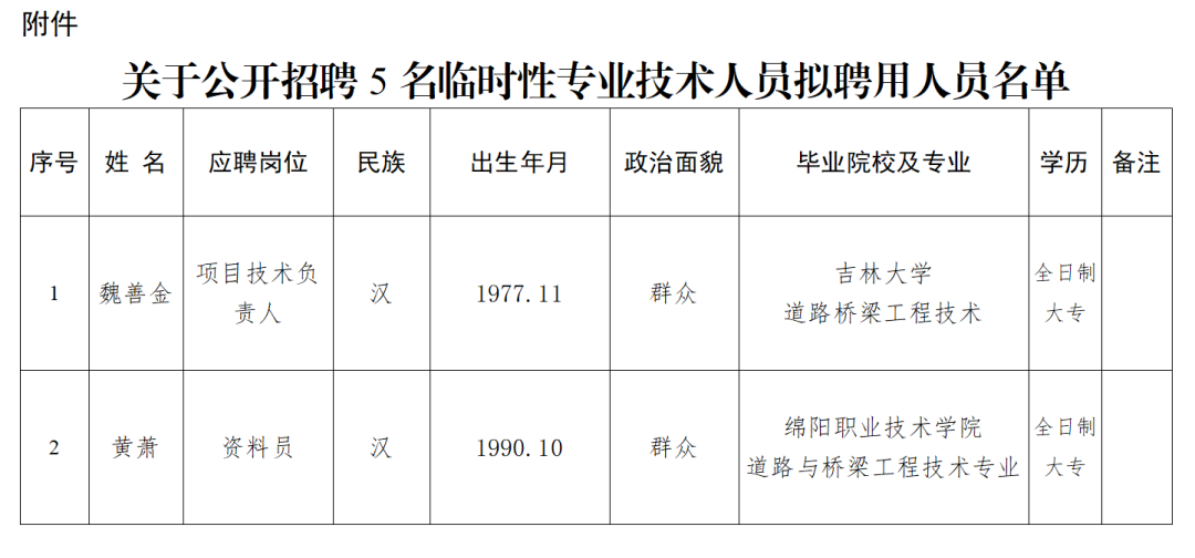 附件:關(guān)于公開招聘5名臨時(shí)性專業(yè)技術(shù)人員擬聘用人員名單
