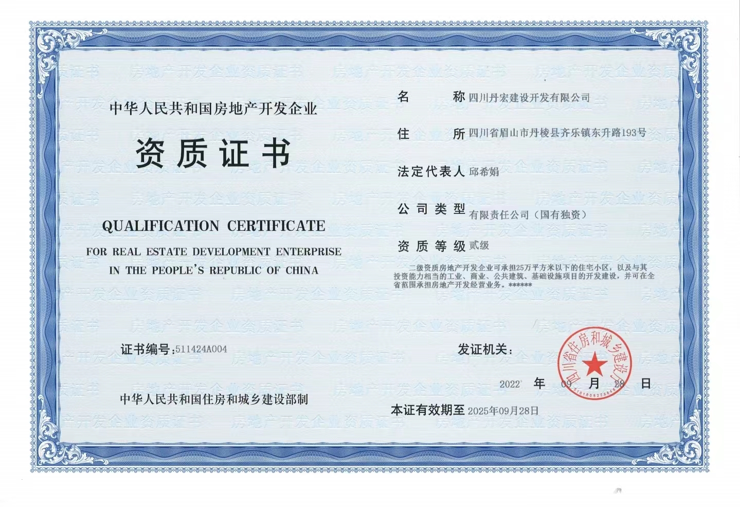 近日,丹發(fā)展集團下屬的四川丹宏建設開發(fā)有限公司順利通過了四川省住房和城鄉(xiāng)建設廳資格審核,成功獲取了房地產(chǎn)開發(fā)二級資質(zhì)。標志著丹宏公司可承擔建筑面積25萬平方米以下項目的開發(fā)建設,并可在全省范圍承擔房地產(chǎn)開發(fā)經(jīng)營業(yè)務,為進一步擴大建設規(guī)模及開發(fā)區(qū)域奠定了堅實基礎。