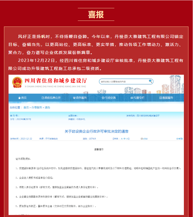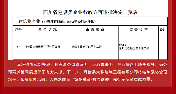 【縣大雅建筑公司】喜報(bào)!成功升級“建筑工程施工總承包二級”資質(zhì)!